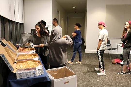 During the event, librarians and tutors are available to assist students with their projects if needed. Students take scheduled, structured breaks throughout the event, which include things such as a yoga stretch break, a few minutes of watching cute videos, and a group popping of bubble wrap. Pizza is also served halfway through the event.