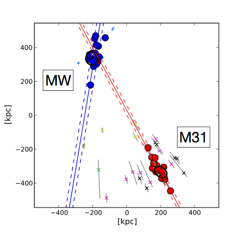 In a new study published by the Monthly Notices of the Royal Astronomical Society, it is claimed that MOND also provides a natural explanation for the satellite planes. The study assumes that the Milky Way and Andromeda started with plausible initial conditions (the “Hubble flow”) and had masses consistent with the stars and gas we actually detect in them. Solving the equations forwards, the galaxies end up with their observed distance and velocity—after a fashion. In MOND, their much stronger gravitational attraction implies they had a close flyby when the Universe was about half its current age.