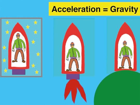 The guy in the rocket would be floating in it (if in a region with no significant gravitational forces), or if he and the rocket were in free fall in a gravitational field, as astronauts are in the Space Station (left). If he is in an accelerating rocket (middle) or at rest in a gravitational field (right) he cannot tell unless he cheats (by looking out of a window).