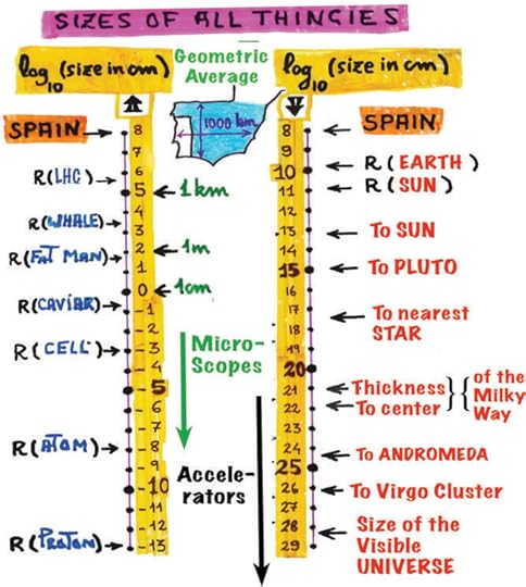 The sizes of “all” things, on a logarithmic scale in centimetres. The Large Hadron Collider has a radius of about 7 km. A caviar egg, a few millimeters. Spain has a geometric (or logarithmic) average size, in the ensemble of all sizeable things.