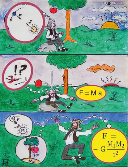 Newton’s laws of the equal but oppositely directed forces of action and reaction (top). Newton’s apocryphal apple leading him to discover the relation between force, mass, and acceleration (F=Ma) (center), as well as the expression for a gravitational force between two objects, in terms of their masses and the distance between their centers (bottom).