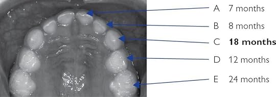 Tooth eruption dates vary from person to person, and up to 1 year either side of the standard dates should be allowed. See the below diagram for the standard dates for the eruption of baby teeth. Normally, primary teeth fall out and new teeth erupt more-or-less simultaneously, so any 1-sided delay, beyond a few months, should be investigated. Causes for delay are most commonly local obstruction by a supernumerary or impacted tooth or because there is insufficient space for it to erupt into.
