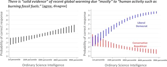 Scientists need to reinforce this reservoir of trust by listening and communicating with integrity, clarity in distinguishing fact from speculation, and fairness in representing arguments for and against alternative views. But that trust is a weaker determining factor for public attitudes than political or religious identification. Polling surveys offer guidance about how to educate the public on controversial scientific topics in the light of existing partisan divides. The challenge is illustrated starkly for the case of climate science by results in the figure below from a study by Kahan. Kahan’s and similar surveys show the partisan divide on the existence and causes of global warming growing much stronger as general scientific literacy increases. The polarization grows presumably because better-educated individuals are more skilled at finding or offering arguments that appear to confirm their pre-existing biases, even if those favored arguments misrepresent the underlying science.