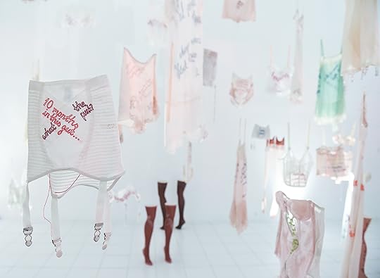 K: I’m interested in Every Curve , where vintage garments typically associated with the feminine—bras, stockings, knickers—are hand embroidered with hip-hop lyrics. As a feminist and a lover of hip hop, I’m often asked about the treatment of women in certain artists’ lyrics, so this work speaks volumes to me. Can you talk about how you selected the lyrics by Tupac Shakur and Notorious B.I.G. and the garments, and why you were drawn to antique pieces in particular?