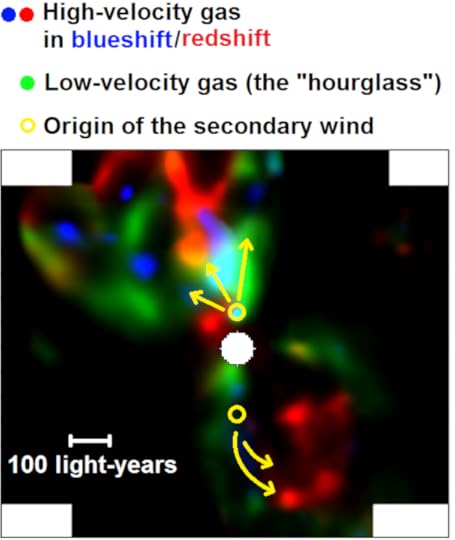 The second stage of the wind formation is more dramatic and occurs when a powerful jet of particles, collimated by a strong central magnetic field, hits a large molecular cloud (made mainly of atoms of hydrogen), located at about a hundred light-years from the black hole. Without a confining surface, the jet would dissipate its energy in an almost useless way out of the galaxy, but with the energy injected in this cloud, it could be spread by means of a thermal wind (called the secondary wind), capable of blowing out the gas to even more distant regions from the nucleus.