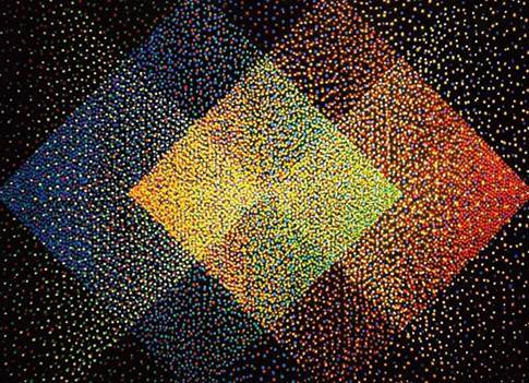 Painting 1 clearly represents a single object, if unfamiliar, with a stable structure guaranteeing the objects endurance. In painting 2, we do not see an object that we would attribute an enduring structure to, but rather just something we may call a ‘unit’, something that has some form of integrity, in virtue of the closeness of dots and a boundary separating them from the dark background. In painting 3, again, we do not see objects, but various units. In fact, we can discriminate different units, depending on what we focus on, color or distribution of dots.