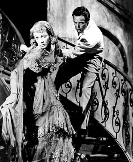Similarly, Brando learned a great deal about improvisation from black jazz artists. Yes, we know that improv was essential to the Method acting of which he is the inevitable exemplar, but Brando was much more like a jazz musician with his surprising and even playful improvisations. In Streetcar Named Desire (1951) Brando is Stanley Kowalski, a confused, often-violent man child like many of the characters he played in the 1950s. Early in the film, he explores the items in a trunk that belongs to his wife’s sister, Blanche. Not at all happy with the amount of family money that Blanche seems to have spent on her clothes, he manhandles a white stole. As tiny white feathers drift away, and as Stanley is in the midst of an argument with his wife, he picks feathers out of the air with the purposeful purposelessness of a child. Brando found a way to react in character outside of any scripted directions. Like jazz improvisers working out their ideas “in the moment,” he was fully in control of his craft as an actor.