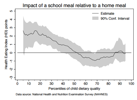 When I began researching this topic, the literature was a mixed bag with regards to how school meals stacked up against a home-prepared meal: some found a negative effect within the general population, others a positive effect for low-income children, and yet others found no impact at all. There are a variety of reasons why one might expect conflicting results, such as when and where the data was collected and how exactly one measures diet quality, but the one glaring oversight to me was that all studies focused on the average impact. This one detail is particularly important in the context of school meals when we consider the vast heterogeneity in the quality of US children’s at-home diets as compared to the rather homogenous, federally-regulated school meal.