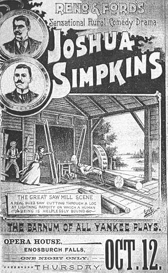 Much of opera house entertainment was provided by regional traveling companies like Reno and Ford, which presented Joshua Simpkins, a “sensational rural comedy drama,” in the opera house in remote Enosburgh Falls, Vermont. © Image courtesy of the Enosburg Historical Society.