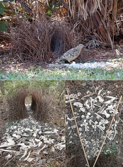 As we might expect, some animals use this phenomenon to their own advantage. Recently, a study on guppy fish (the brightly coloured tropical species often kept as a pet) showed that males preferred to associate with rival males that a female would not be strongly attracted to. In doing so, he may make his own appearance look better (more colourful), and improve his own mating chances. Males also manipulate female perception of size and distance. Work in the last few years at Deakin University by Laura Kelley and John Endler has shown that bowerbirds can manipulate female choices through creating illusions. Bowerbirds, found in New Guinea and Australia are famous for males building elaborate bower structures often decorated with gaudy objects. Females inspect the male’s bower and decide whether to mate with him or not. In the great bowerbird (Ptilinorhynchus nuchalis) males build a tall bower of sticks with an ‘avenue’ running through it. Females stand at one end and watch as a male waves colourful objects at her from the other end. He does this against a backdrop of plain grey objects (stones, bones, and other things; which presumably enhances the colour of his displays).
