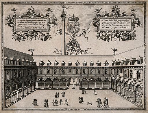 Officially opened in 1571, the Royal Exchange of London was designed to be the center of commerce. This etching, which is modeled after a 1507 version, shows various people conducting business in the courtyard.