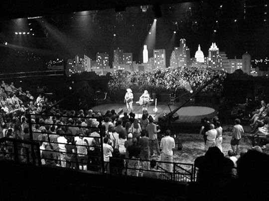 The audience out front takes in Gillian Welch and David Rawlings along with the new skyline backdrop.