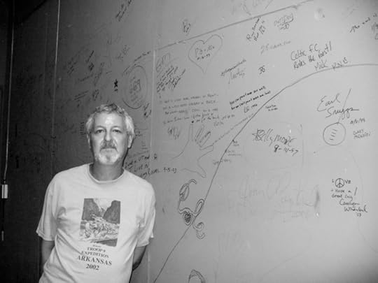 stands before the Austin City Limits signing wall on the 2d floor of station KRLU, a memorial to a long-cherished tradition for staff members and artists. Photo by Tracey E. W. Laird
