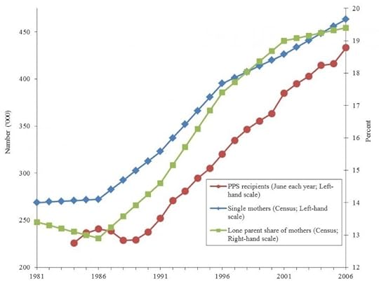 A significant demographic trend in recent decades, in Australia and a number of other developed countries, has been the growth in lone parent families as a proportion of all families. As the graph shows, in 1981, 13 per cent of Australian mothers with dependent children were lone parents; by 2006, this had risen to 20 per cent. Associated with this increase has been growth in welfare dependency of mothers of dependent children, women who may otherwise have depended on a combination of partner income and income from their own part-time employment.
