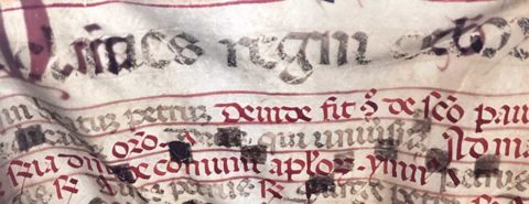 The original manuscript from which this lampshade was made would have been a large book, perhaps made up of a whole calf- or sheepskin per folio or per opening: a book that was big enough for an assembled choir of monks, or nuns, or canons to see and sing from. Its present crumbling state is due not simply to the leaves being excised from their host book, but from the damage that happened when the volatile electric light set fire to the lampshade more than a century ago. As the lampshade deteriorates, so, too, fade voices from the past together with the skill and craft that produced the original manuscript. Here, the fragile fragments are perhaps the only remnants of an object that was used in services of worship where the singing lifted hearts and music upwards. It’s a shame that this medieval book was not similarly venerated when the person with a knife possessed and destroyed it.