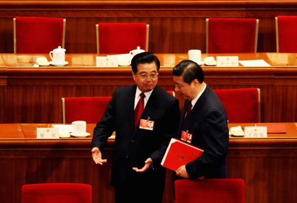 Chinese President Hu Jintao (L) talks with Vice President Xi Jinping as they leave after the closing session of the National People’s Congress on March 13, 2009 in Beijing, China. (Photo by Guang Niu)