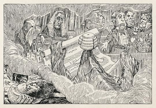 Eighth of Henry Holiday’s original illustrations to “The Hunting of the Snark” by Lewis Carroll. This illustration covers Fit the Sixth: The Barrister’s Dream. The Snark is in the foreground, in barrister’s robe and wig, and is acting to defend his client.