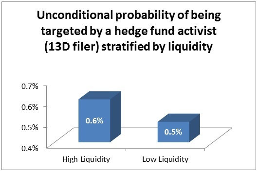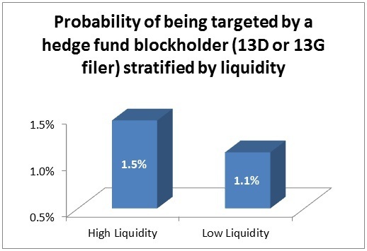 First, liquidity increases the likelihood that an activist hedge fund acquires a block (a stake of at least 5%) in a firm. To address concerns that there could be reverse causality (governance causes liquidity, rather than liquidity causing governance), or omitted variables driving both governance and liquidity, we use the decimalization of the US stock exchanges in 2001 as a natural experiment. This event led to a sudden increase in liquidity that was not caused by changes in governance.