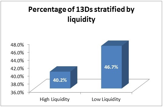 Our final finding concerns voice. Our first result, stated earlier, was that liquidity increases the likelihood of block acquisition, but our second result was that it decreases the likelihood of a 13D, conditional upon block acquisition. We find that the first effect outweighs the second. Thus, liquidity increases the unconditional incidence of voice. Coupled with its positive effect on exit, liquidity has an overall beneficial effect on governance.