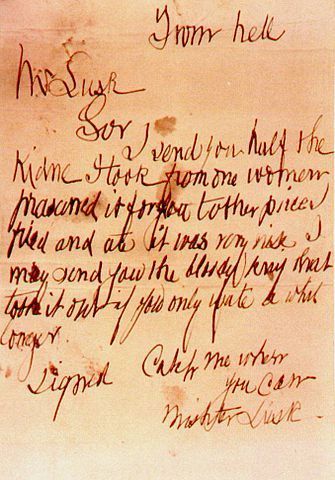 Image credits: (1) The “From Hell” Letter postmarked 15 October 1888. Original in the Records of Metropolitan Police Service, National Archives, MEPO 3/142. Public domain via Wikimedia Commons. (2) Streetmap showing the locations of the first seven Whitechapel murders 1894. Public domain via Wikimedia Commons.