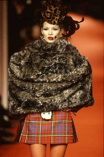 Moschino’s use of tartan for their 2013 A/W collection is a particularly interesting example of this, drawing on traditional Scottish heritage fabric and design. Tartan has featured throughout many designer collections over the years, and is favoured by designers such as Vivienne Westwood, whose A/W collection shown at the fashion week of Feb 1993 included tartan garments modelled by Naomi Campbell and Kate Moss (pictured).