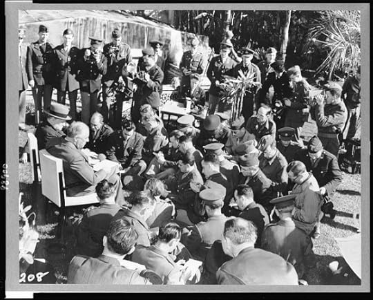 President Roosevelt, with Prime Minister Winston Churchill at his side, reading the “unconditional surrender” announcement to the assembled war correspondents. Casablanca, French Morocco, Jan 1943. Image courtesy the Library of Congress.