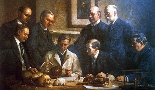 Piltdown Gang by John Cooke (1915). Back row: (left to right) F. O. Barlow, G. Elliot Smith, Charles Dawson, Arthur Smith Woodward. Front row: A. S. Underwood, Arthur Keith, W. P. Pycraft, and Sir Ray Lankester.