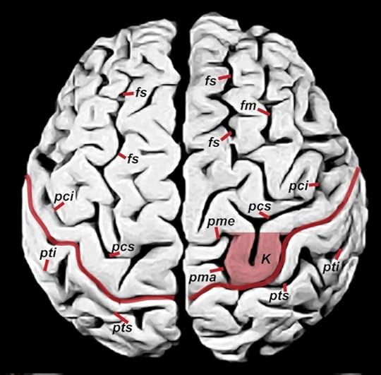 Superior view of Einstein’s brain, with frontal lobes at the top. The shaded convolution labeled K is the Omega Sign (or knob), which is associated with enlargement of primary motor cortex for the left hand in right-handed experienced string-players.