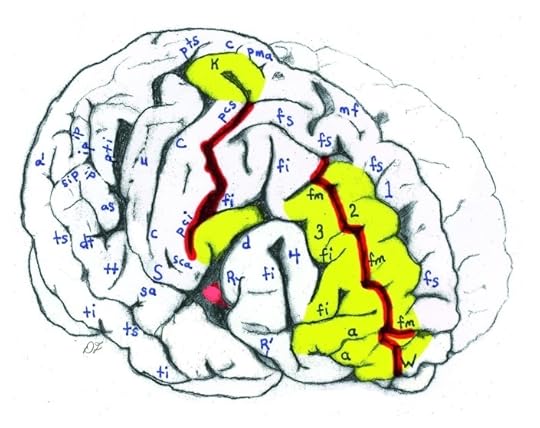 Tracing from photograph of the right side of Einstein’s brain taken with the front of the brain rotated toward viewer. Unusual sulcal patterns are indicated in red; rare gyri are highlighted in yellow.