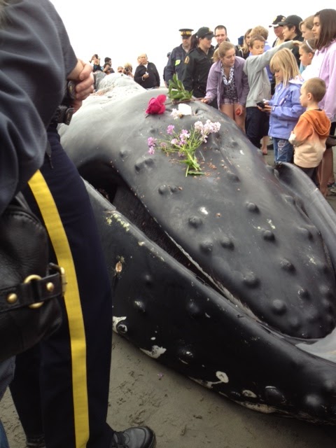 Crowds of people were gathered around it, and a few people had placed flowers on its head. I hate to think of it suffering such a horrific death, frightened and far away from its mother, who must have stayed with it as long as possible. When the mothers give birth down in Hawaii and other tropical places, they don't feed for months, starving while the baby nurses and gains enough strength to make the trek to either Alaska or the Antarctic, where the mother can feed again. My heart breaks for them both.