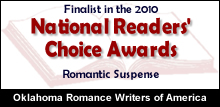 Anyway, she'd personally called me to say that Cover of Darkness was a finalist! The winner will be announced at RWA Nationals in NYC later this month, just like the National Readers Choice Award winner will be. Had I known I would final in these prestigious contests, I would for sure have attended Nationals! I'm so bummed. To think I could have sat with Roxanne St. Claire and Brenda Novak--twice--and schmoozed with NY Times bestselling authors.