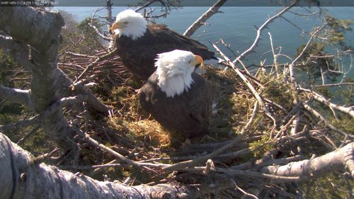 The eggs will hatch 35 days after being laid, so here's the link if you're interested in watching the live camera feed. Scroll down to the bottom of the page and click on the Play button for either the wide angle or close up feeds. I prefer the close up, so I can watch the wind ruffling their feathers and see the eggs when they shift in the nest. This pair of mates has been together for a while, and you may recall the posts about the baby twins last year. Very entertaining to watch them trying to figure out how to fly :)