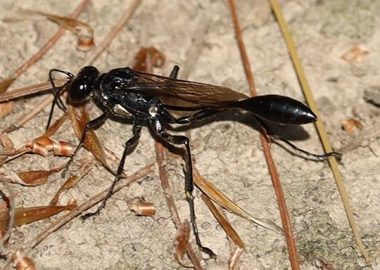 But sometimes chance steps in as it did earlier this week. The Gold-marked Thread-waisted Wasp, one of the most elegant looking wasps in this area, dropped onto the ground in front of me as I was just steps from the parking lot.