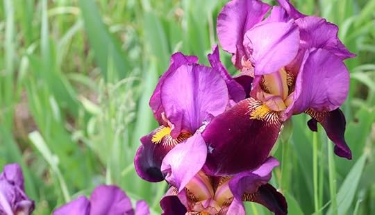 The Irises had sprouted in the middle of a grassy meadow without other wildflowers in it. The full cluster was three feet tall with multiple blooms of the extravagant purple flowers. An explosion of colour in the otherwise monotone setting. It looked to me to be out of place as if it had no business being there. But there it was in all its glory.