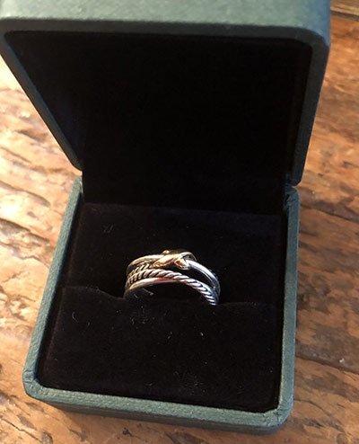 I had a vision for this ring, a replacement for one I’d worm for over fifty years. Silver and gold bands entwined—I’d looked online and found nothing resembling my idea and was resigned to finding a jeweler to make one.