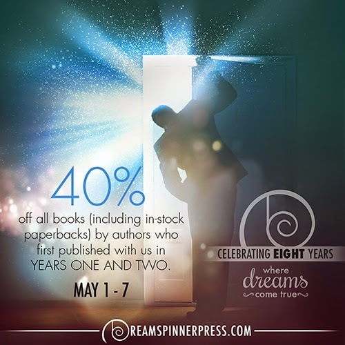 Dreamspinner is celebrating eight years this month. There will be different sales every week so keep an eye out for your favorite authors and get their books at a 40% discount. I joined DSP in 2009, year two, and all my books, including pre-orders and paperbacks, are on sale this week. Check it out!