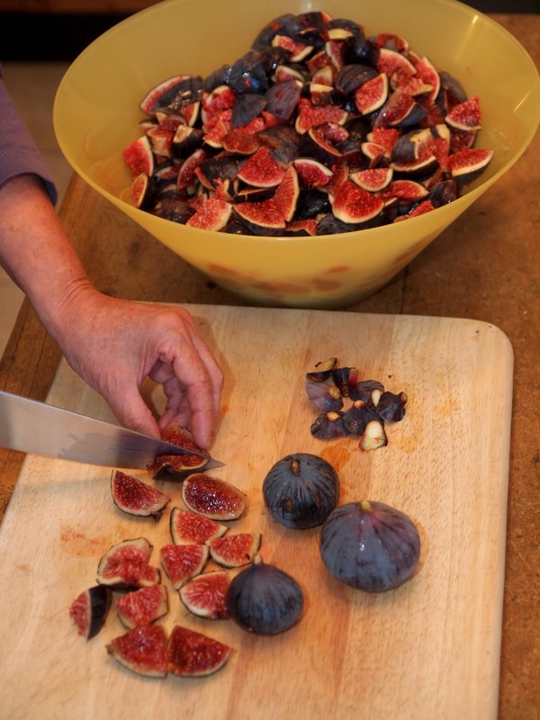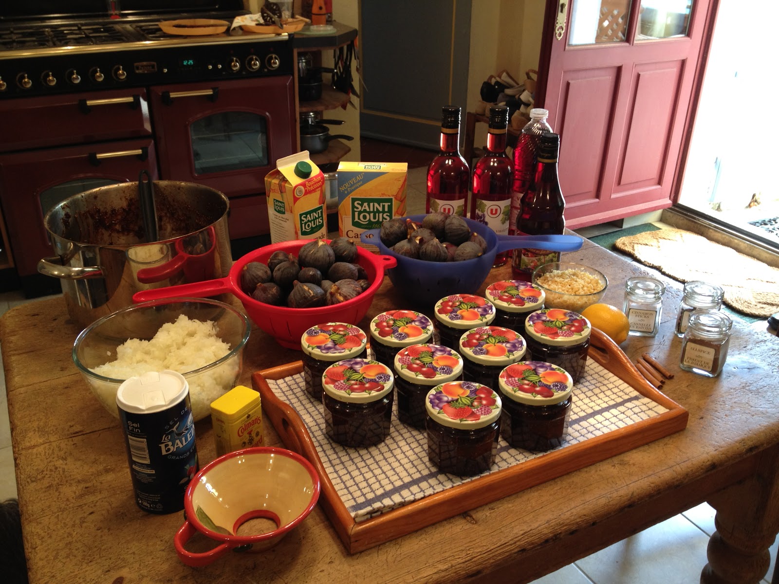 As I walked in the door, I was enveloped in the steam coming from the stove – the sharp edge of vinegar and fresh ginger softened by cinnamon and the sticky slow dissolving of the figs. Mollie and David’s kitchen is the stuff of dreams. There’s a rustic front kitchen with heavy beams, well scrubbed wooden counters and a groaning red range with room for six bubbling pots. Glass front cabinets with crystal tumblers, a shelf of neatly labeled spices in squat glass jars.