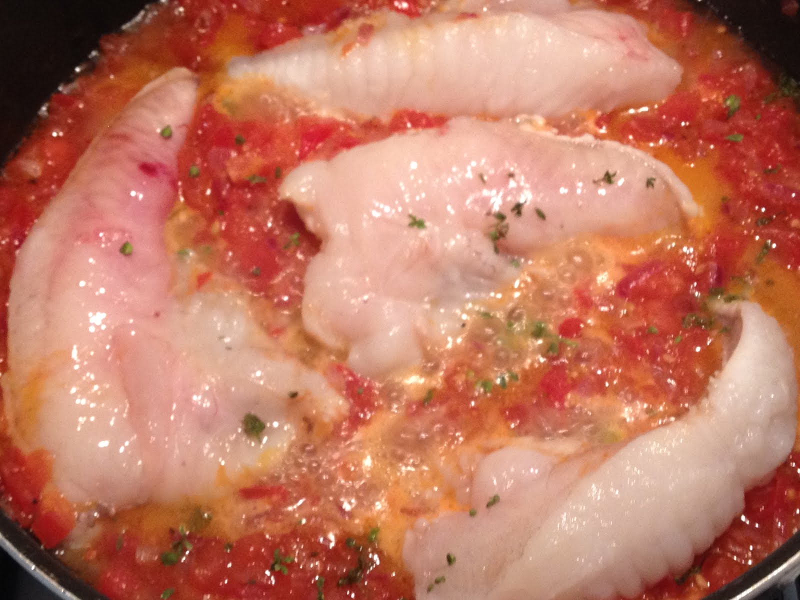 Heat olive oil in a good size frying pan. Saute onion until translucent, 4-5 minutes. Add chopped tomatoes and sugar, simmer 5 minutes. Add wine, simmer 3 minutes more. Add Nora pepper or paprika, stir to combine. Add fish fillets and thyme. Cover and simmer on medium-low for 10-15 mintues, turning the fillets once midway through. Cooking time will depend on the size of your fillets - start checking early. Be gentle - monkish, when properly cooked, has a nice firm texture like lobster, you don't want to boil it to mush.