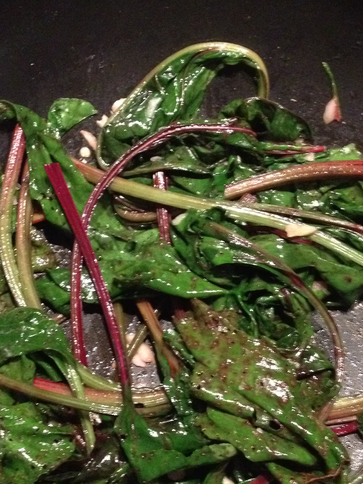 Heat the olive oil in a large frying pan (or wok), add garlic and saute for 30 seconds to 1 min, until the garlic is fragrant. Add the damp greens, stir to coat with olive oil. Cook 2 minutes uncovered, then cover partially and continue cooking until greens are tender (I actually like them slightly charred), 3-4 minutes more.
