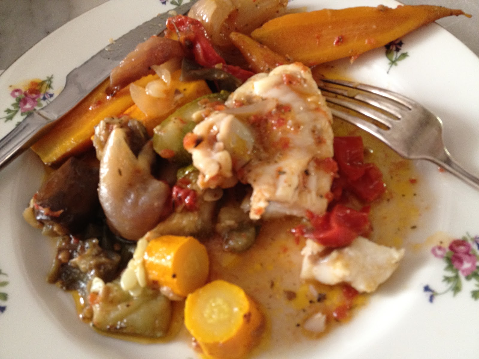 Serve hot or warm, use the slick olive oil tomato sauce left at the bottom for pasta the next day. Use leftover veggies and sauce to cook fish (the photo below is monkfish filet), or as filling for an omelet.