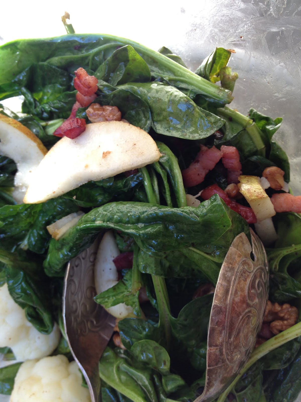 In a large frying pan, fry up 8 oz. of lardons, or diced slab bacon. When the bacon has rendered it's fat and begun to crisp up, add a generous handful of whole walnuts. Stir until coated and crisp - about 1 minute more. Shut the heat. With a slotted spoon, remove the bacon and walnuts to a seperate dish. Put your washed spinach leaves into the warm pan and stir to coat with the bacon fat. Add a teaspoon of olive oil, a generous pinch of sea salt, a teaspoon of balsamic vinegar and a good grinding of pepper. Toss the whole lot, right there in the pan.