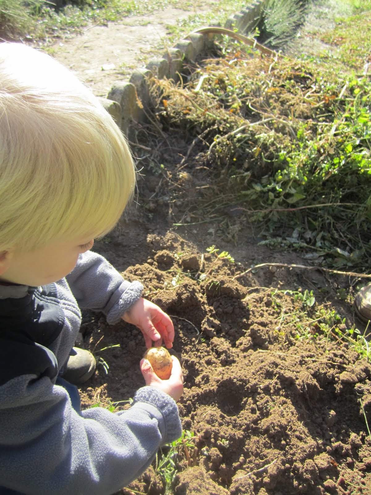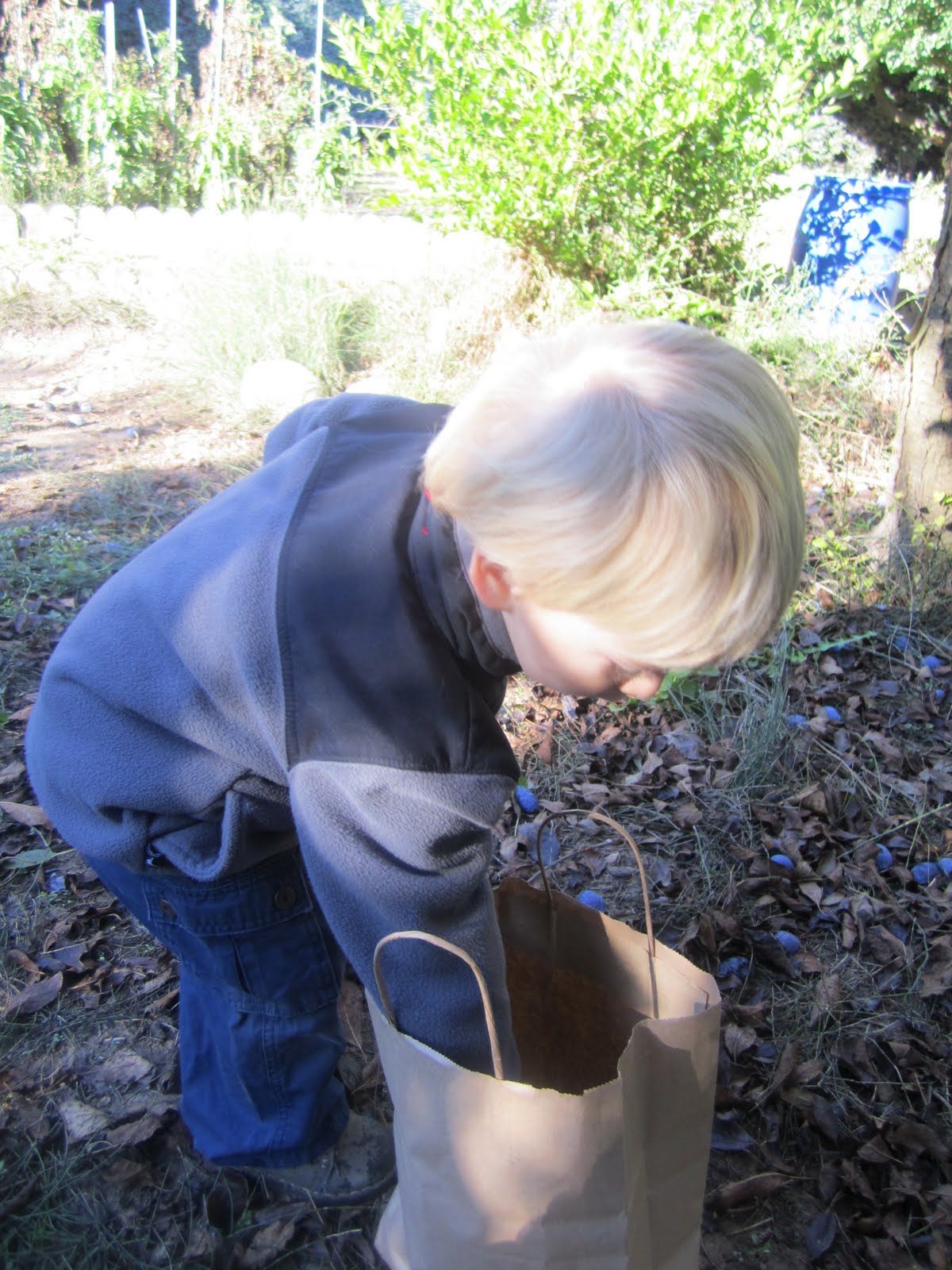 As a writer, it's not every day that I admit a picture's worth 1000 words. This past Wednesday, I spent the morning with Augustin, collecting storm-fallen walnuts and plums, and digging "NY" potatoes (those planted in May by yours truly!) in Mr. C's garden. No other narration seems necessary. Only one word of explanation - about the plum pits. Mr. C informed me they were picked clean and left there by the crows, who, gourmets one and all, don't like to eat things off the ground.