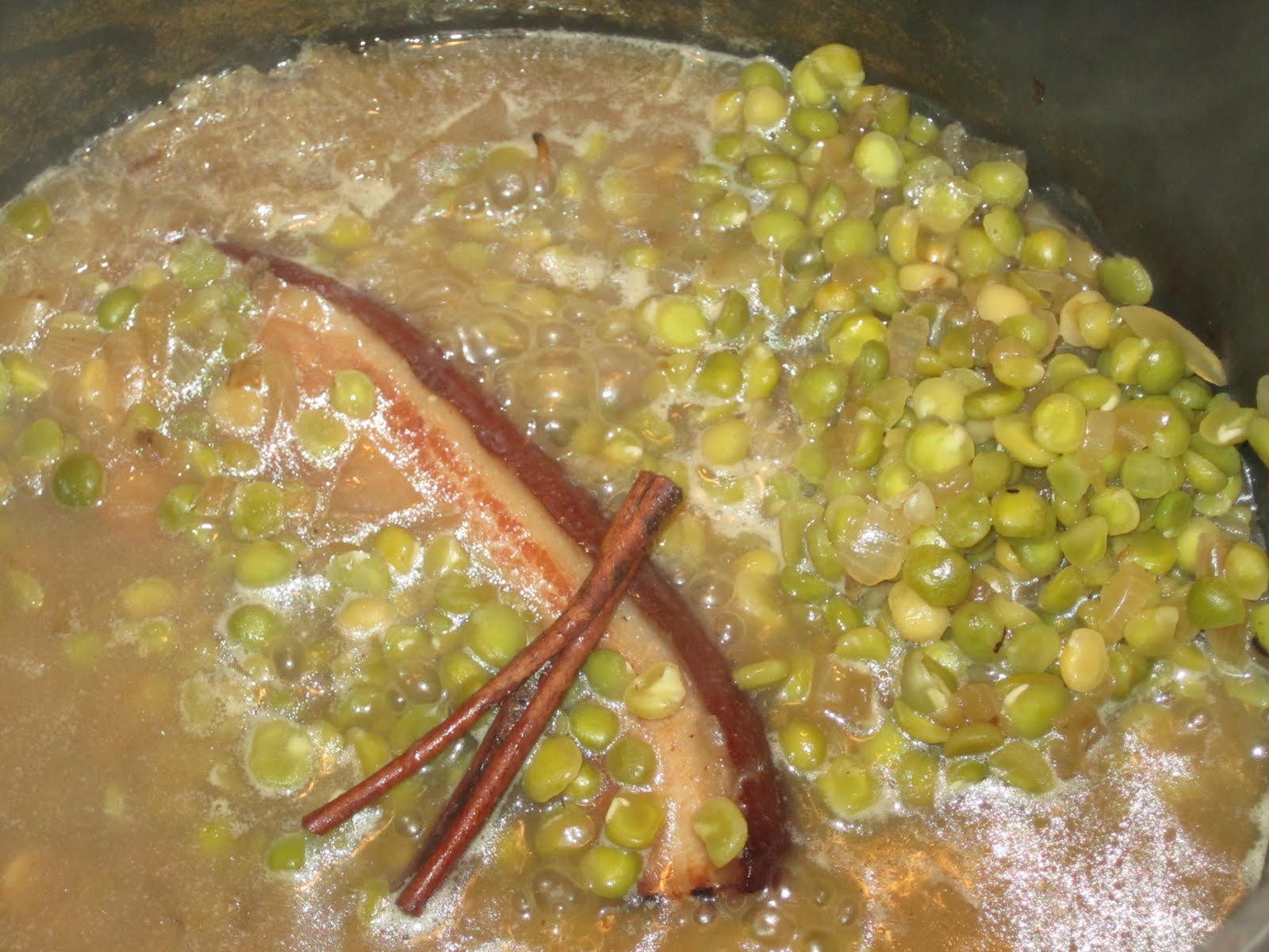 It's not precisely de-tox, but spilt pea soup is a winter favorite of mine. Ideal for a one bowl meal - if you play your cards right, your spoon will stand up by itself. I add a good slab of pork belly (a ham hock or a hunk of pancetta will also do nicely) for a meaty flavor. A cinnamon stick and 2 or 3 cloves add depth and a slight sweetness. My mom remembers making this with sherry or vermouth (sounds like Julia Child to me), but I added a swig of cognac we had laying around. Very nice indeed.
