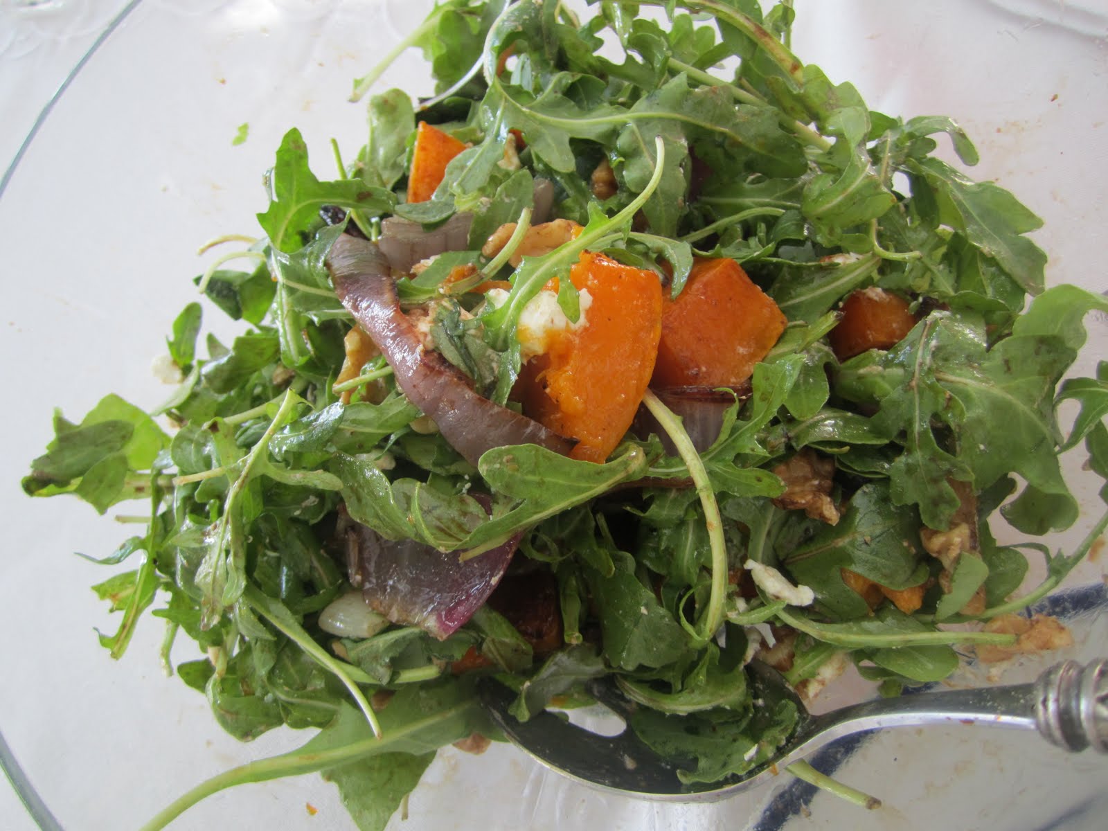B. made a lunch of all my favorite things – simple oven-roasted salmon, a lightly dressed arugula salad with roasted butternut squash, red onions, walnuts and lumps of goat cheese. And for dessert, a beautiful Hungarian cherry cake.