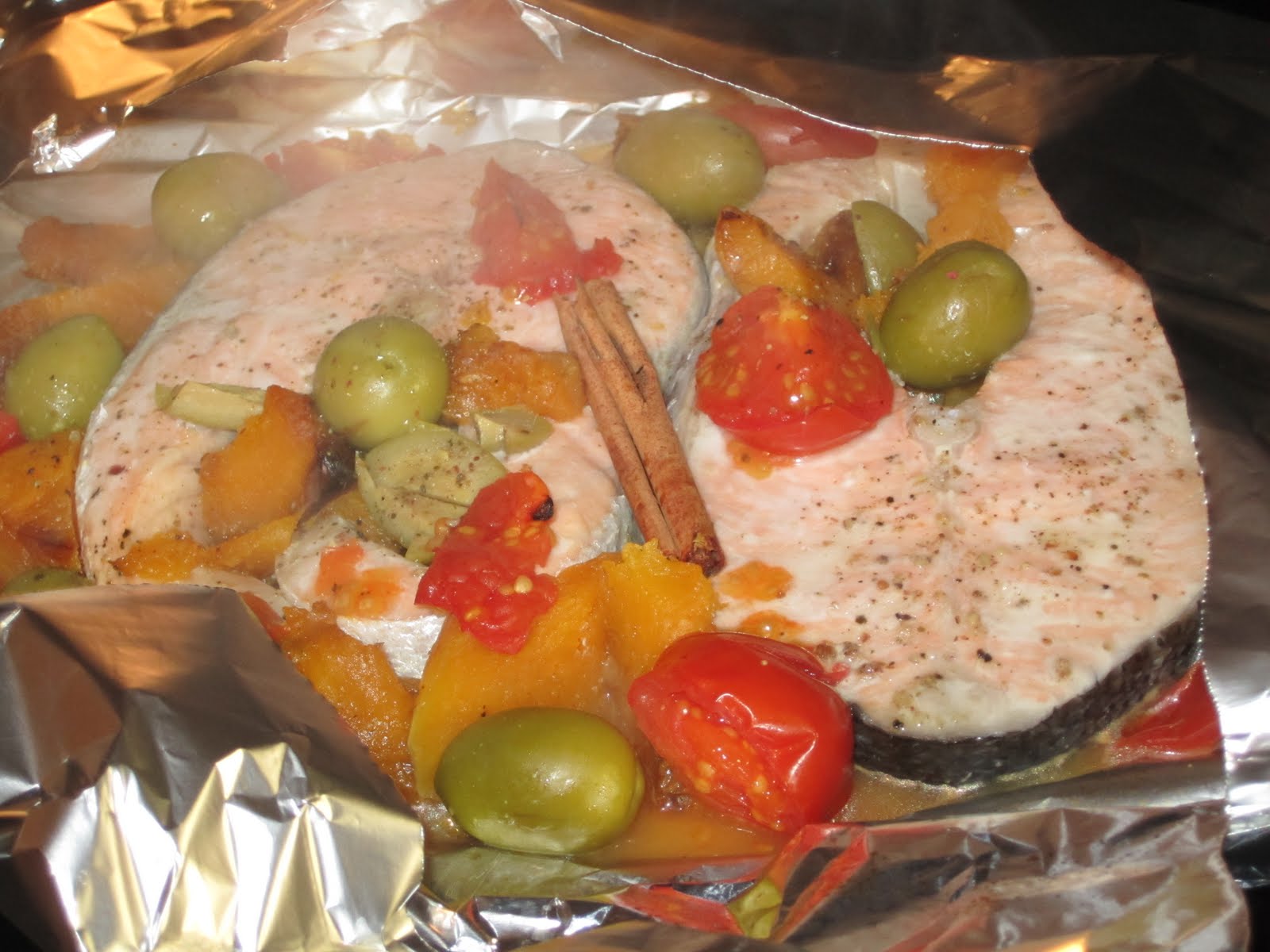 Preheat the oven to 375F. Place a large piece of aluminium foil (several inches larger than your fish) on a cookie sheet. Place the salmon steaks, scatter with squash, olives, and tomato. Tuck in the cinammon stick (or a small pinch of cinammon if you don't have sticks), sprinkle with sea salt, grind over a bit of mixed peppercorn. Add a bit of white wine. Cover with another piece of aluminium foil and fold to seal the edges into a neat air-tight packet. Cook until the package is puffed and fish is cooked through, between 15-20 minutes.