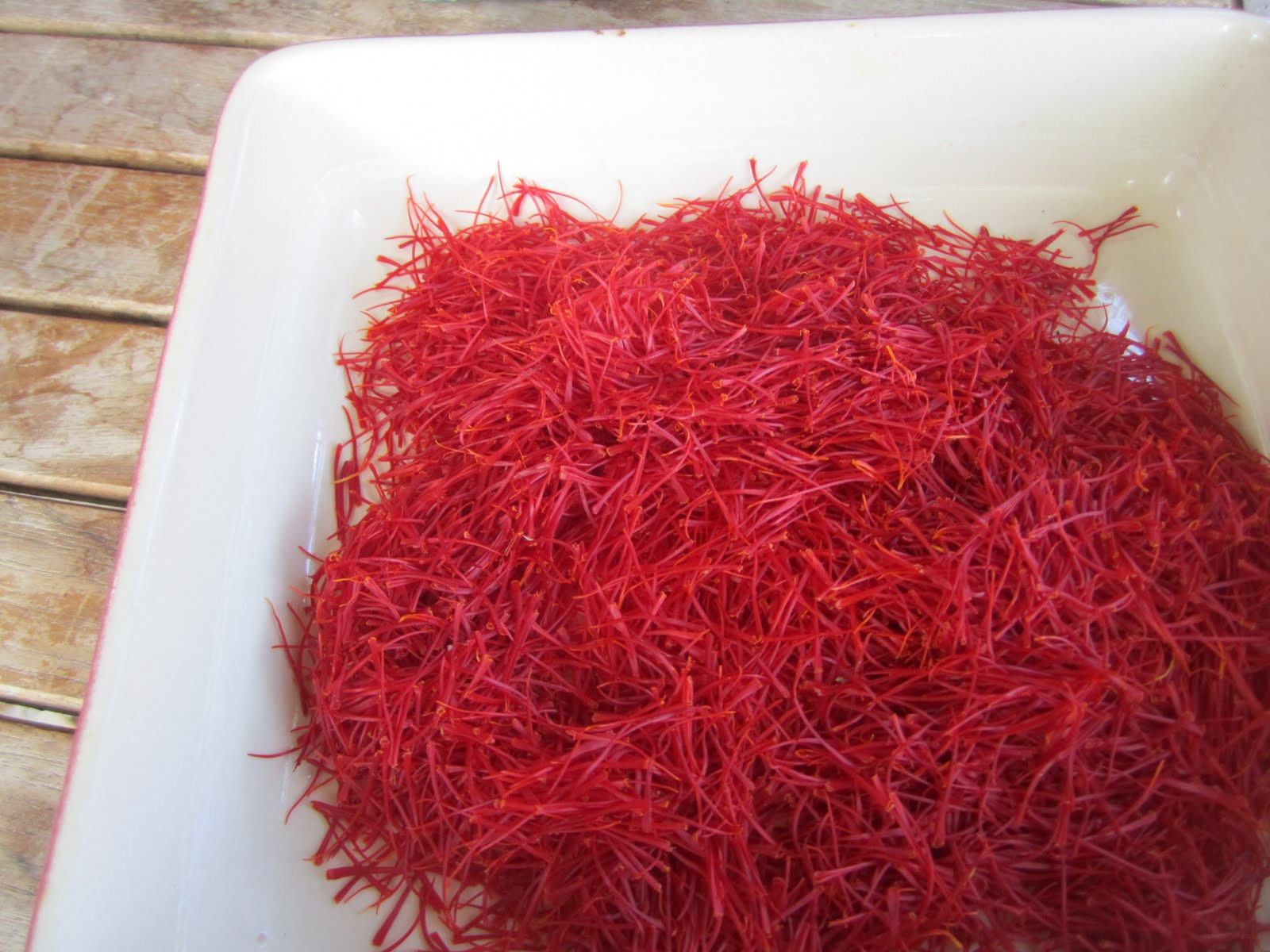 When we arrived at the farm, yesterday's harvest was already on the table outside the kitchen door, hundreds of delicate purple flowers, recently denuded of their valuable threads.