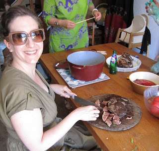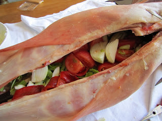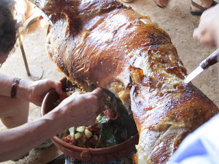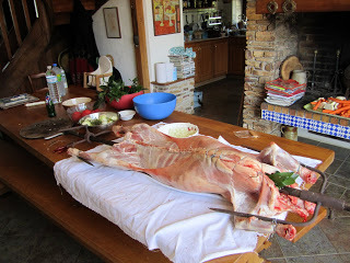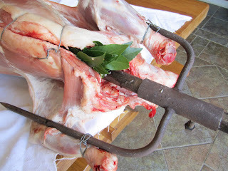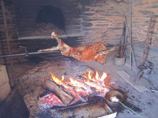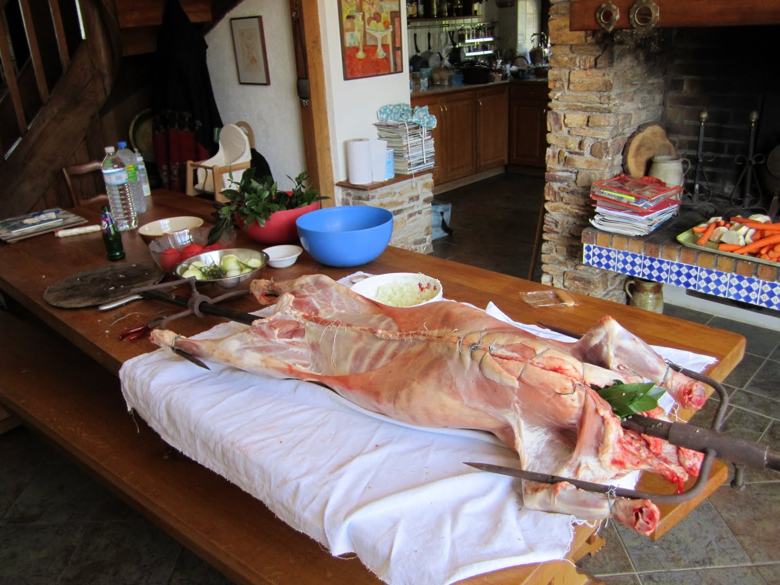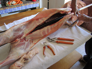 Meanwhile, the lamb was hoisted - not by me - into the flames. A.'s spit is a homemade affair, rigged with rusting bicycle gears.