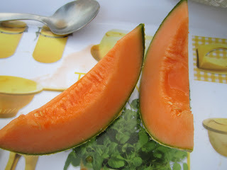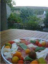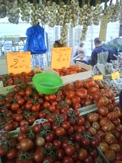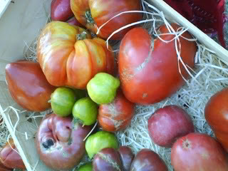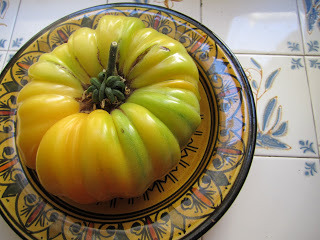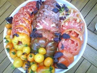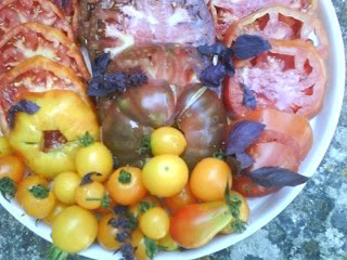 I could say I've been cooking - but that would be a slight distortion - it's more like arts and crafts: combining, stacking, slicing and dicing a few essential summer ingredients: tomatoes, tomatoes, melon, jambon cru (raw ham), peaches, plums, figs, tomatoes. And did I mention the tomatoes? I haven't turned on the stove in weeks.The Provencal tomato is a thing of wonder - small as a marble, large as a human heart, red like a valentine, yellow like a sunflower, orange like an overripe apricot, bright green like a brand new leaf, even purplely olive, like seaweed seen through moving water. The names are equal to the colors: Ananas (Pineapple), Noire de Russie (Black Russian), Brin de Muguet (Lily of the Valley).There's no messing with perfection (ok, a little messing, just for fun) - a few crystals of coarse sea salt, a drizzle of local olive oil and a sprig or two of purple (yes, royal purple, my favorite childhood color) basil.