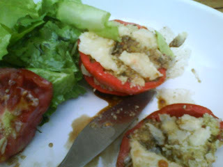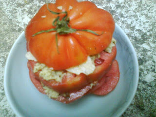 Last night I got a little fancy and layered slices of beefsteak tomato with artichoke puree and slivers of parmesan.