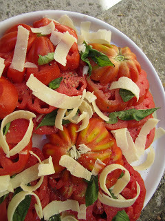 Friends who sold all their worldly goods to go on an extended trip around the world stopped in for lunch (yes, even people freshly moved to Provence can experience travel envy) - and I discovered that my vegetable peeler makes very nice parmesan curly whirlies for yet another tomato salad. Excuse the close up. Tomato porn. Yes, must move on.